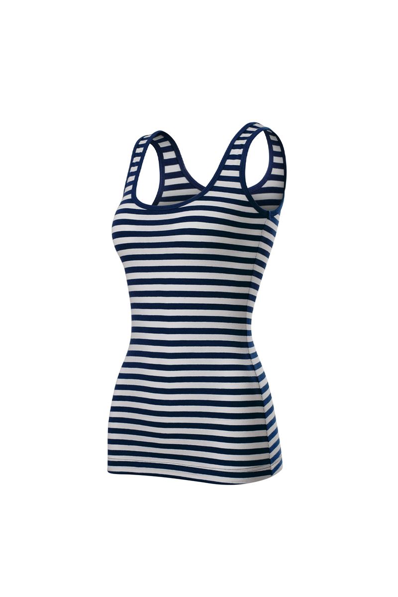 Díky širším ramínkům tílko dobře sedí a je pohodlné i při celodenním nošení. Sailor top je ideální volbou na léto, volný čas, dovolenou i jako základní kousek pro vrstvení.